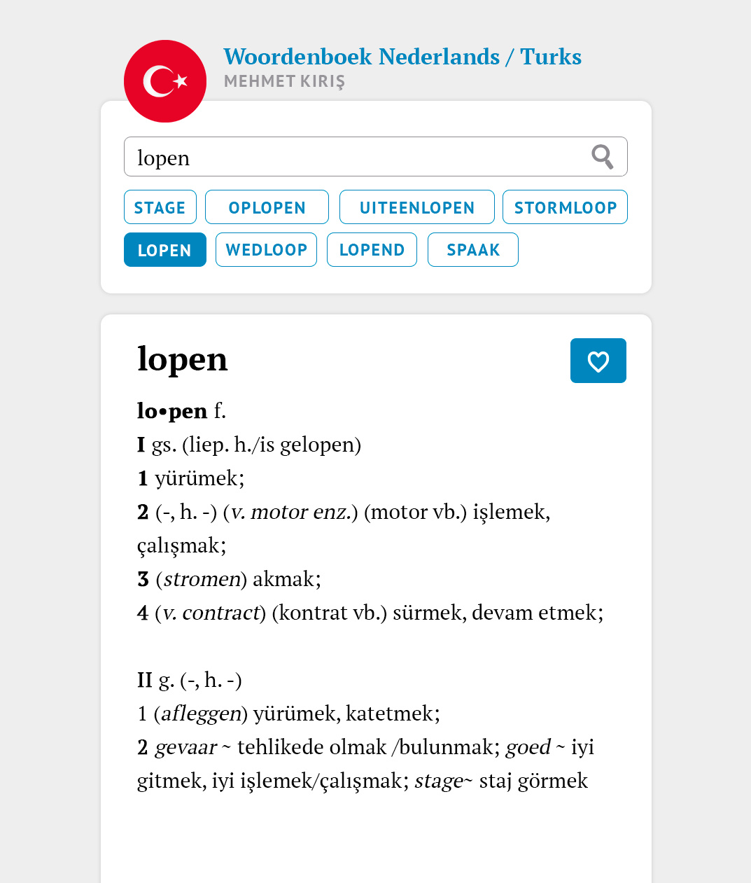 Het Nederlands / Turks - Turks / Nederlands is te doorzoeken met de beste zoekfunctie voor woordenboeken. Zo zoek je altijd breed en contextueel.Zoek je bijvoorbeeld op het begrip lopen dan krijg je uiteraard het begrip lopen. Maar er is meer. Automatisch en razendsnel wordt er namelijk breder gezocht, zodat je altijd de beste resultaten hebt en begrippen contextueel kan plaatsen.Wat krijg je?